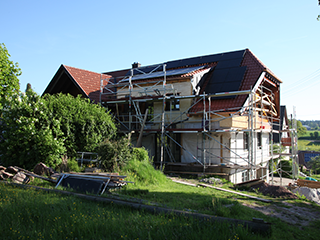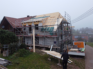 Man sieht es auf den ersten Blick: Ein großer, harmonischer Anbau vergrößert die Lebensqualität. Harmonisch, auch dank der neuen Dachkonstruktion. Die Dachform als Krüppelwalmdach bildet konstruktiv eine Einheit mit dem „alten“ Dach. Eine gelungene Konstruktion, die alle begeistert: Bauherrschaft und uns als ausführende Zimmerer, Dachdecker und Blechner.